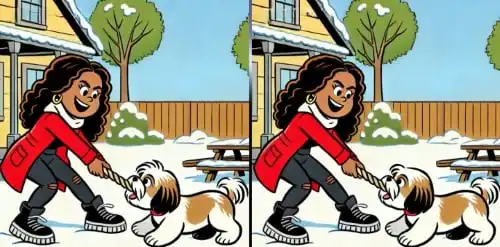 Šiame mielių meškėnų paveikslėlyje sumaniai pasislėpęs haskio šuniukas. Jį rasti per 7 sekundes yra tikras dėmesio ir erdvinio suvokimo išbandymas.