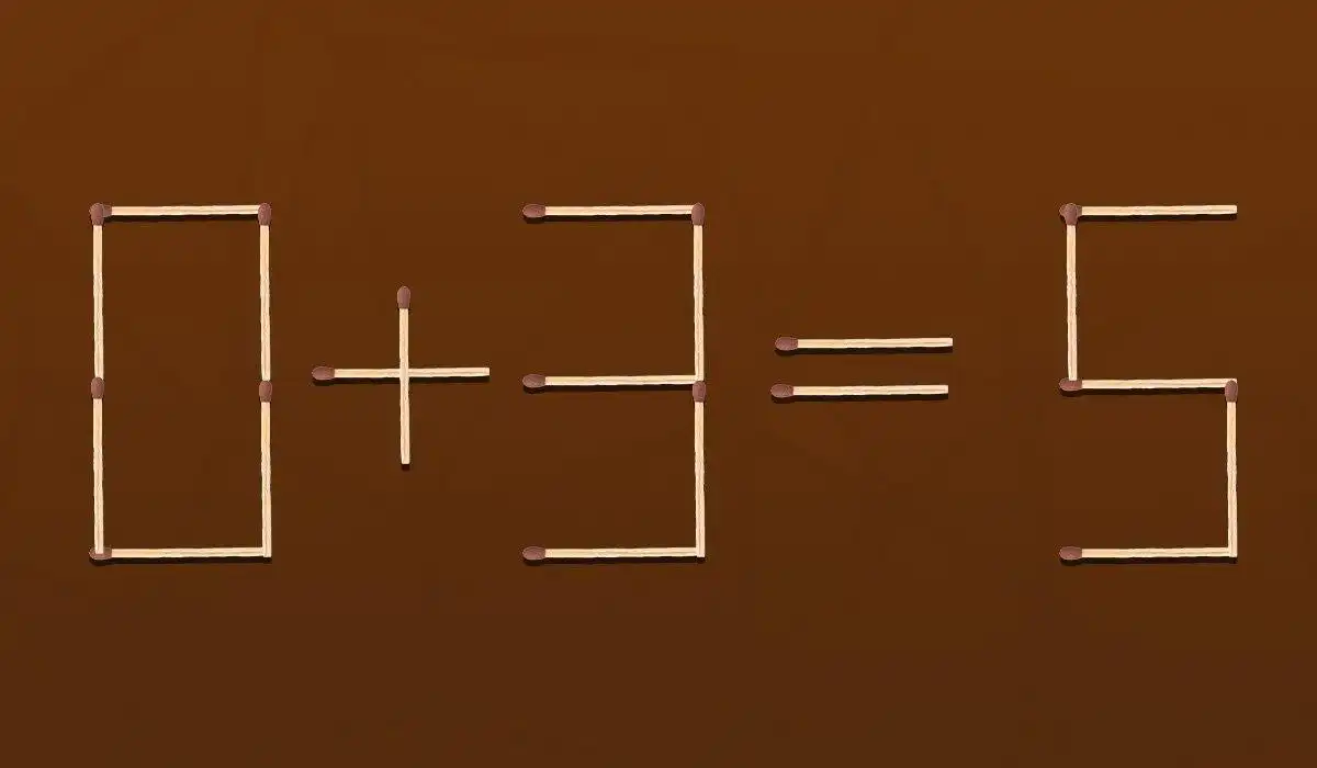 Šis degtukų galvosūkis siūlo ištaisyti neteisingą lygtį 0+3=5, perstatant tik vieną degtuką. Sprendimas slypi ne skaičiuose, o pačiame matematinio ženklo transformavime.