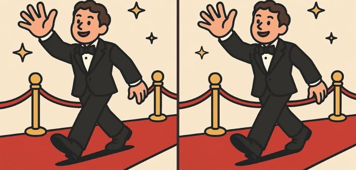Šiame galvosūkyje jums reikia per 91 sekundę surasti tris skirtumus tarp dviejų iš pirmo žvilgsnio identiškų raudonu kilimu einančio vyro paveikslėlių. Paslaptis slypi smulkmenose – atidžiai stebėkite detales, pradedant nuo veido iki kilimo krašto.