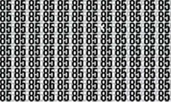 Šioje galvosūkio nuotraukoje tarp daugybės vienodų skaičių 85 paslėpti du kiti – 86 ir 35. Jūsų užduotis – juos greitai surasti. Pasiseks tiems, kurie ieškos ne tik skaičių, bet ir jų orientacijos erdvėje.