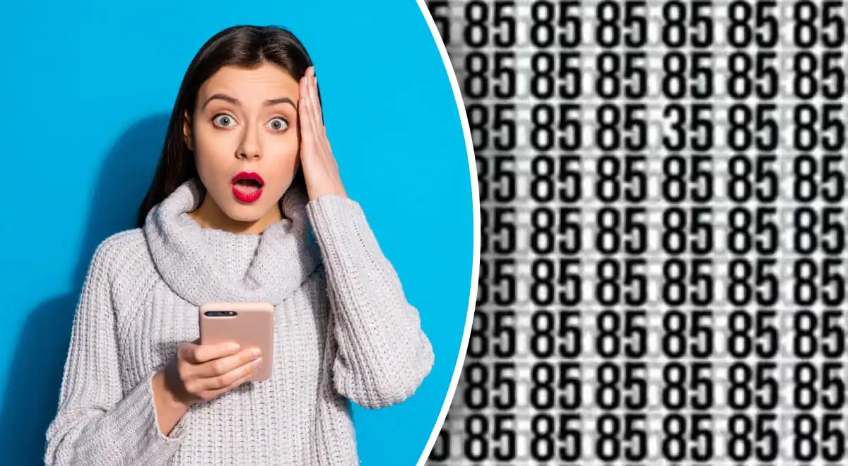 Paveikslėlyje visi skaičiai, išskyrus du, yra „85”. Jie taip pat yra vienodai pasukti. Pagrindinis triukas slypi tame, kad vienas iš tinkamų skaičių yra ne tik kitoks, bet ir apverstas aukštyn kojom. Tai skaičius 86. Jis paslėptas apatiniame dešiniajame kampe – pažiūrėkite į paskutinę eilutę, šiek tiek į kairę nuo centro. Jūs pamatysite skaičių, kuris atrodo kaip „98”, bet jei pasuksite nuotrauką arba savo galvą, pamatysite, kad tai iš tiesų yra 86.