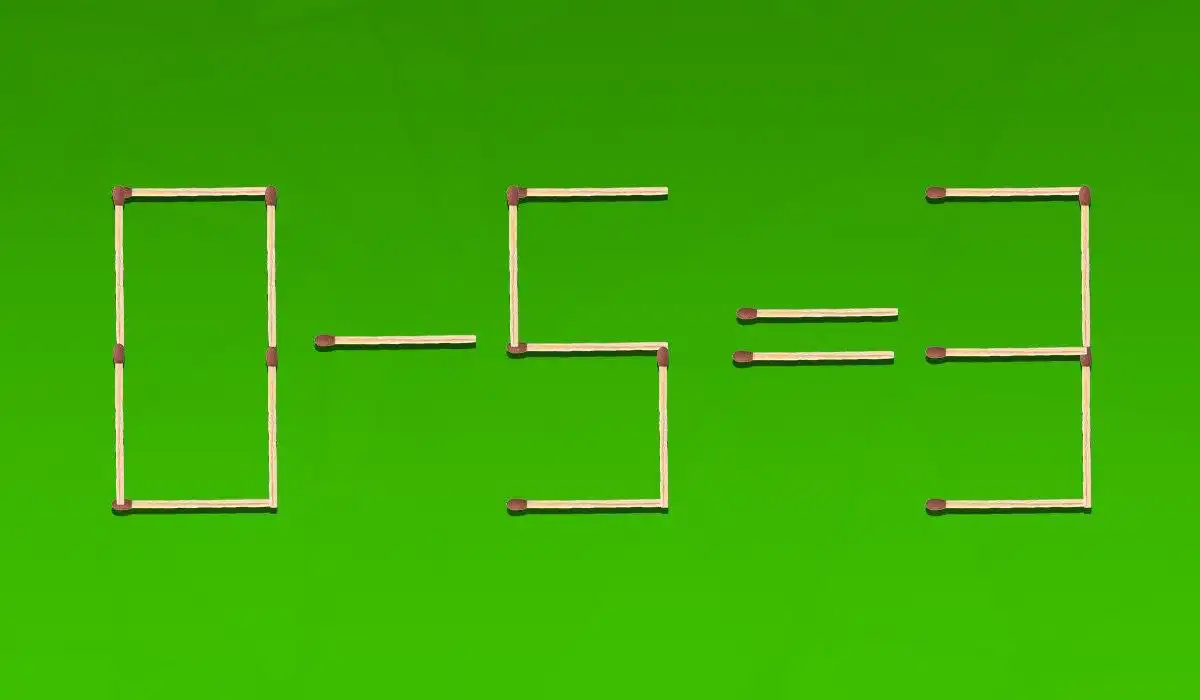 Šiame galvosūkyje reikia pataisyti neteisingą lygybę 0-5=3, perkeldami tik du degtukus. Sprendimas dažnai slypi ne matematinėje formulėje, o kūrybiškame skaičių ir simbolių suformavime iš degtukų.