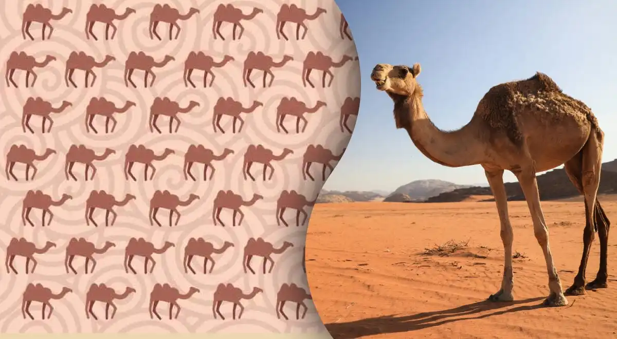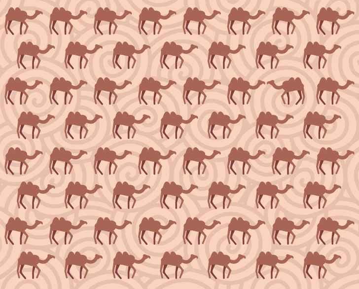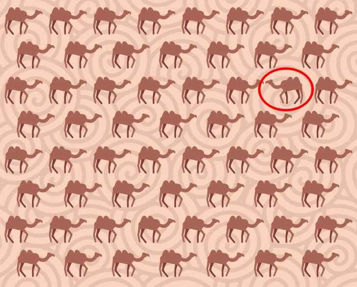 Šioje vizualinėje galvosūkyje jūsų užduotis – per 5 sekundes tarp daugybės identiškų kupranugarių pastebėti vienintelį, kuris skiriasi. Paslaptis slypi ne spalvoje ar dydyje, o vienoje smulkioje, bet esminėje detalėje jo pozoje.