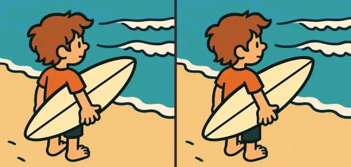 Šis galvosūkis – klasikinis dėmesio ir smulkmeniškumo testas. Prieš jus du beveik identiški banglentininkų paveikslėliai, o jūsų tikslas – per 43 sekundes surasti tris subtilius skirtumus. Paslaptis – skirtumai dažnai slepiasi ne centre, o paveikslėlio kraštuose arba fone.