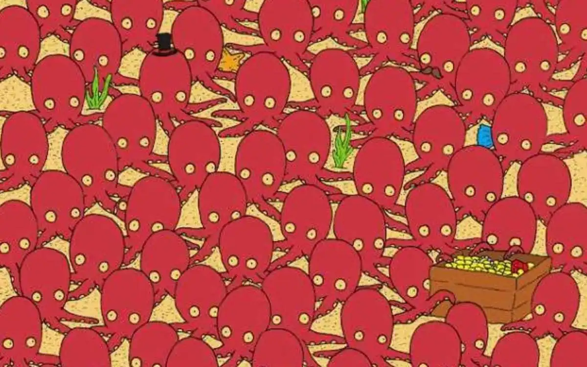 Ar jaučiatės pasirengę išbandyti savo dėmesingumą ir regėjimo aštrumą? Šiame paveikslėlyje, kuris primena paslaptingą jūros dugno sceną, aštuonkojai susibūrę aplink lobio skrynią. Tačiau tarp jų slypi viena gudri žuvis. Jūsų misija – ją aptikti per vos 7 sekundes. Tai iššūkis ne tik akims, bet ir smegenims, reikalaujantis greito perjungimo nuo bendro vaizdo prie smulkmenų.