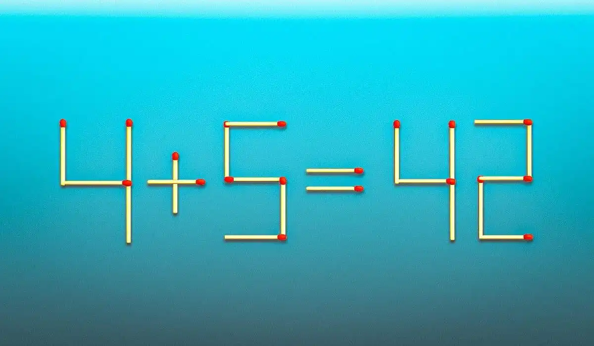 Galvosūkis su degtukais: lygybė 4+5=42 akivaizdžiai neteisinga. Jūsų užduotis – perkelti tik du degtukus, kad ji taptų matematiškai teisinga. Laiko yra vos 18 sekundžių. Paslaptis slypi tame, kad reikia žiūrėti ne tik į skaičius, bet ir į galimus jų pakeitimus.
