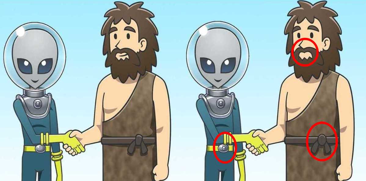 Pirmasis skirtumas yra dešinėje pusėje, ant urvinio žmogaus krūtinės. Viename paveikslėlyje ant jo krūtinės yra papildoma juosta ar raukšlė, kitoje – nėra. Antrasis skirtumas – tai ateivio akis. Viename vaizde viena iš akių (dažniausiai kairiojo ateivio) yra šiek tiek kitaip nupiešta arba turi kitokį atspalvį. Trečiasis ir subtiliausias skirtumas dažnai slepiasi fone arba ant kito veikėjo. Šiuo atveju pažiūrėkite į mažą akmenį arba dirbinį ant žemės prie ateivių kojų – viename paveikslėlyje jo forma ar padėtis šiek tiek skiriasi.