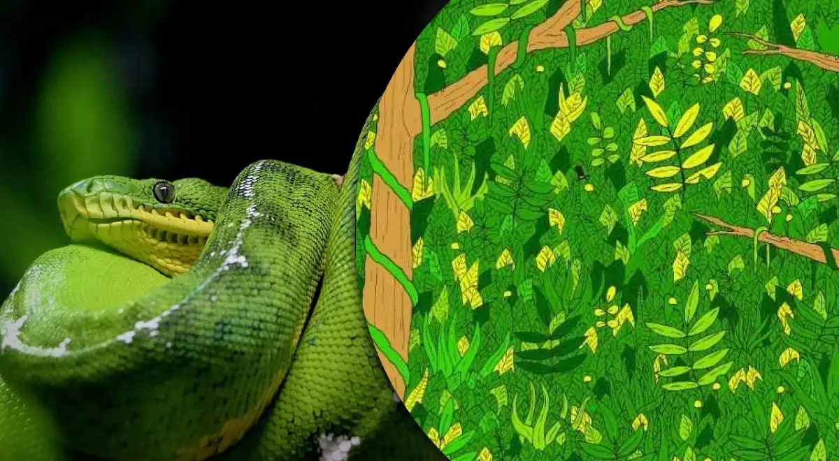 Šioje džiunglių scenoje paslėpta gyvatė, o jūsų užduotis – ją rasti per 5 sekundes. Paslaptis slypi tame, kad reikia ieškoti ne tik formos, bet ir tekstūros bei spalvų, kurios susilieja su aplinka.
