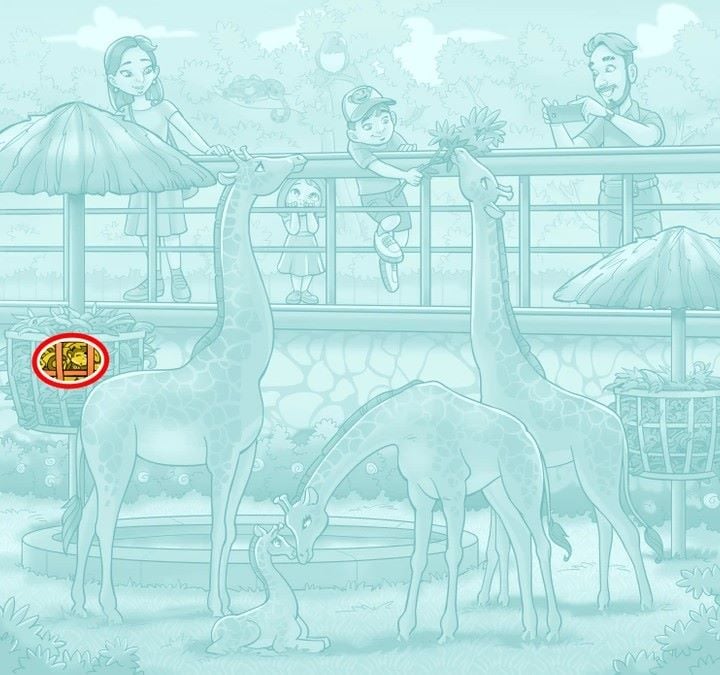 Šioje zoologijos sodo scenoje, tarp žirafų ir žmonių, sumaniai pasislėpusi beždžionė. Norėdami ją rasti per 9 sekundes, turėsite pakeisti savo žvilgsnio kampą ir ieškoti ne tik akivaizdžių formų, bet ir siluetų, kurie susilieja su aplinka.