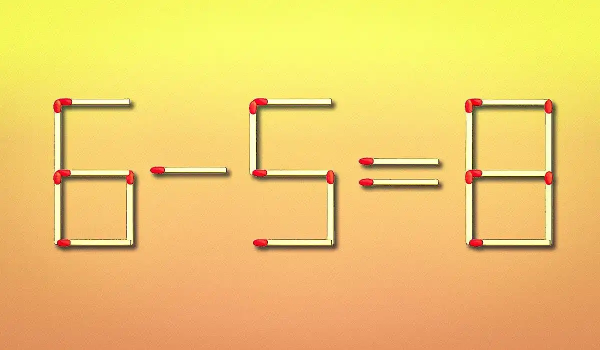 Šioje galvosūkio esmė – perkelti vieną degtuką, kad neteisinga lygybė 6-5=8 taptų matematiškai teisinga. Sprendimas slypi ne skaičiuose, o pačių degtukų formose, kurias galima pakeisti.