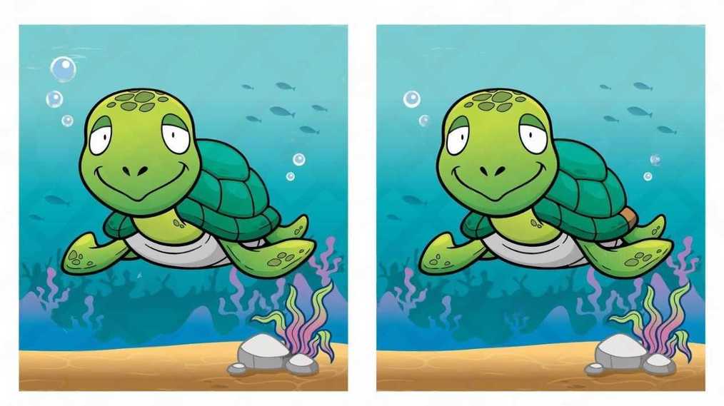 Skirtumas Nr. 1 (Galva): Viršutiniame paveikslėlyje ant vėžlio kaklo, tiesiai po galva, matyti trumpa papildoma juoda linija. Apatiniame paveiksle šios linijos nėra.