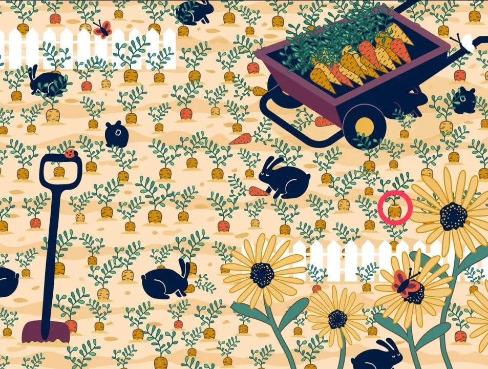 Šiame vaizdiniame galvosūkyje, triušių fermoje pilnoje morkų, paslėptas deimantinis žiedas. Jūsų užduotis – jį aptikti per 13 sekundžių. Paslaptis slypi tame, kad žiedas yra ne ant triušio, o ant vienos iš morkų, beveik susiliejęs su aplinka.