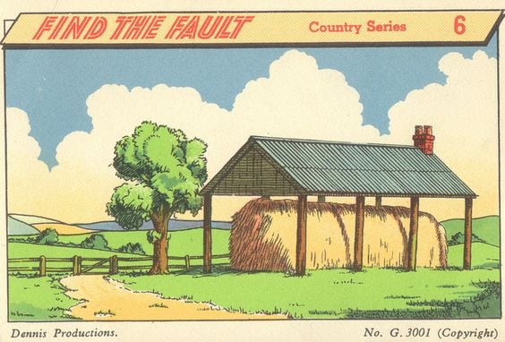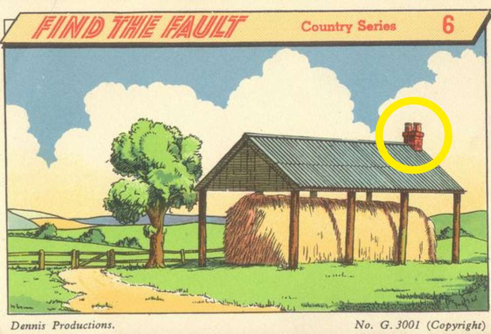 Laikas atskleisti sprendimą. Klaida, kurią reikėjo rasti, yra kaminas ant šieno sandėlio stogo. Šis elementas yra visiška nesąmonė šiame kontekste. Kamino paskirtis – išvesti dūmus iš krosnies ar židinio, kuris šildo gyvenamąjį ar pramoninį pastatą. Šieno sandėlis yra saugyklos pastatas, skirtas laikyti sausą šieną. Jame nėra jokios krosnies ar židinio, kuriam reikėtų kamino. Tokio elemento čia tiesiog negali būti – tai grynas piešimo ar montažo klaidos pavyzdys, kuris puikiai išbando mūsų gebėjimą pastebėti tai, kas netelpa į logišką kontekstą.