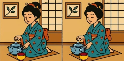 – Dabar nukreipkite dėmesį į arbatos puodelį, kurį ji laiko. Apžiūrėkite puodelio apačią (piedestalą). Dešiniajame vaizde ši apačia yra šiek tiek platesnė arba kitaip nuspalvinta nei kairiajame.