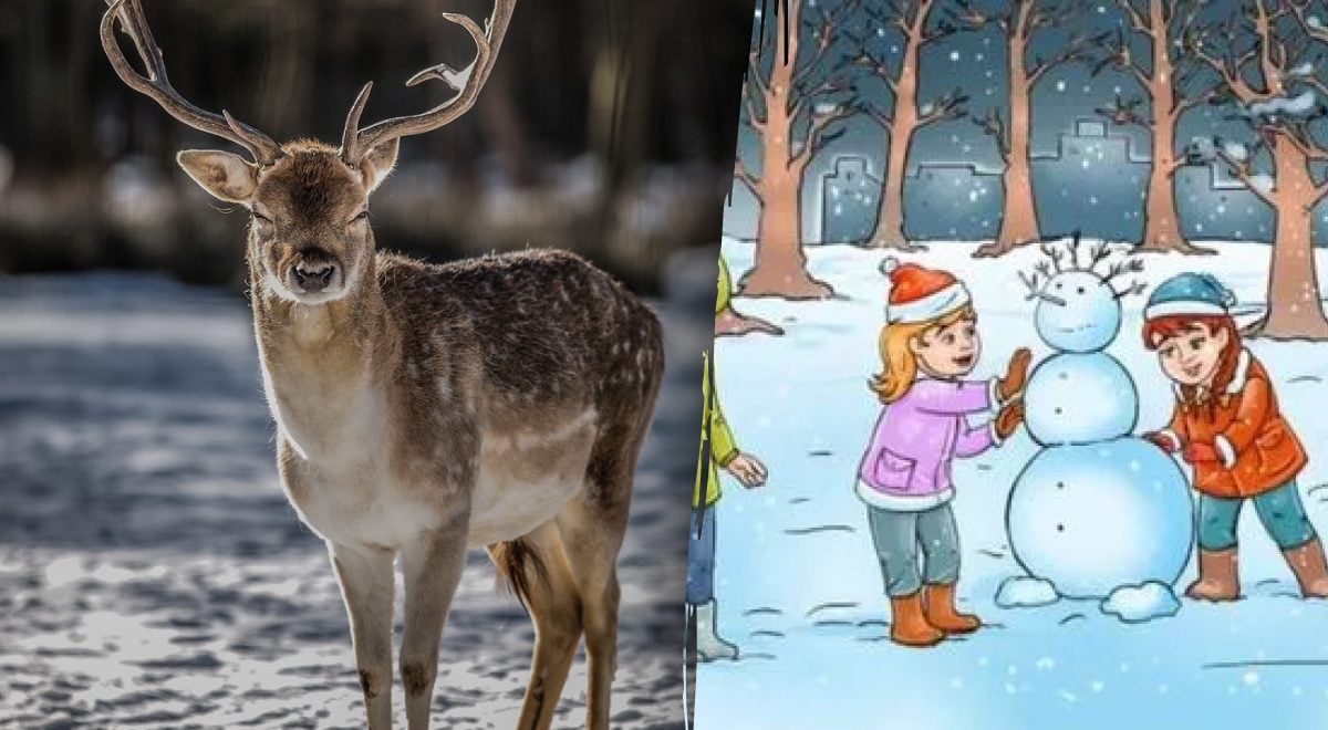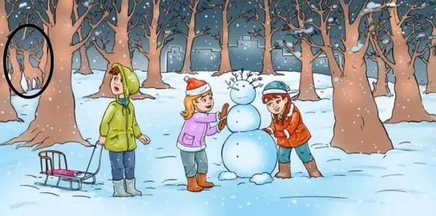 Atrodo, kad nuotrauka rodo paprastą žiemos sceną: trys vaikai linksmai leidžiasi nuo kalno ant rogių ir stato sniego senį. Tačiau kūrėjai čia paslėpė papildomą elementą – šiaurės elnią. Jis nėra akivaizdus, o puikiai įsilieja į aplinką, todėl dauguma žmonių jo iš karto nepastebi. Tai klasikinis vaizdinės percepcijos išbandymas, kuris patikrina jūsų gebėjimą atskirti svarbią informaciją nuo triukšmo.