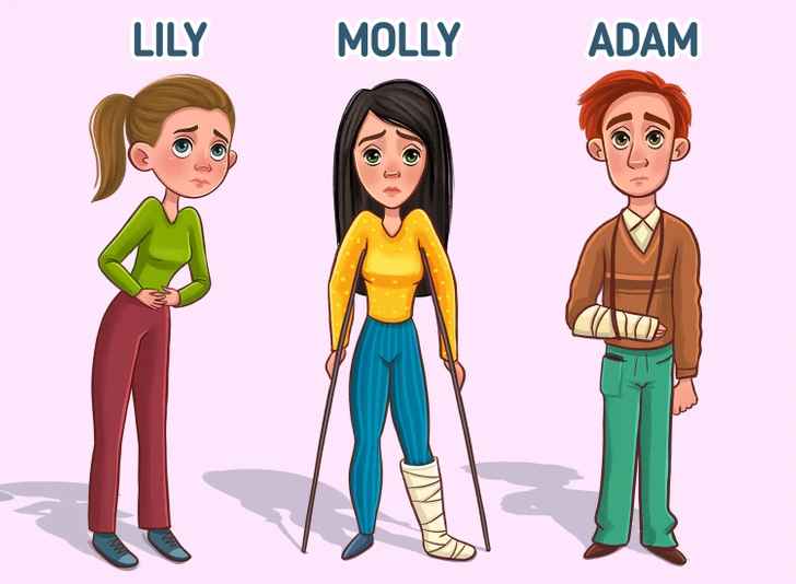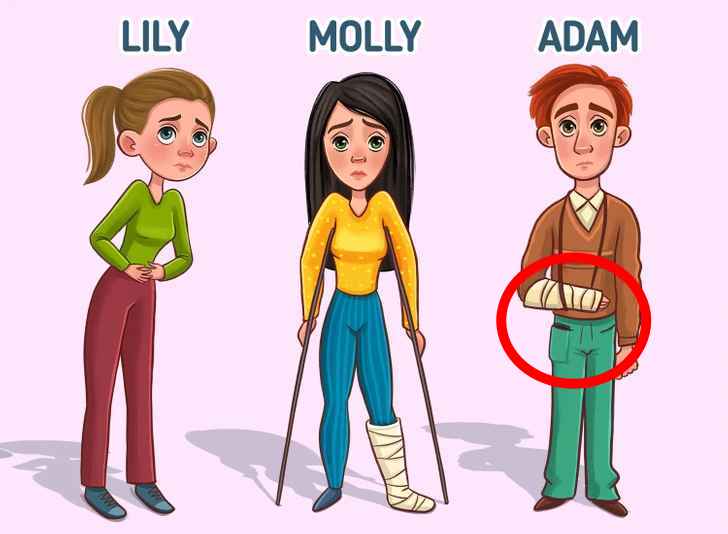 Įsivaizduokite situaciją: trijų žmonių grupėje kas nors apsimeta sergančiu, kad gautų simpatiją ar išvengtų kažkokių pareigų. Jūsų smegenų treniruotė prasideda čia ir dabar. Pažvelkite į paveikslėlį atidžiai. Visi trys asmenys atrodo tikri – vienas su tūzine, kitas su sulaužyta ranka, trečias su aklumu. Tačiau tik vienas iš jų padarė klaidą, kuri išduoda apsimetinėjimą. Ar galite jį pastebėti?