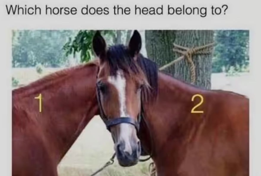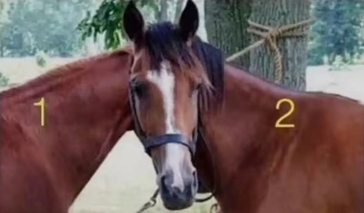 Šioje optinėje iliuzijoje jūsų užduotis – atskirti, kuris iš dviejų beveik identiškų žirgų yra prijungtas prie matomos galvos. Sprendimas slypi smulkmenose, kurias akis iš pirmo žvilgsnio praleidžia.