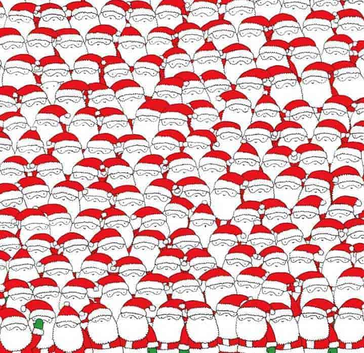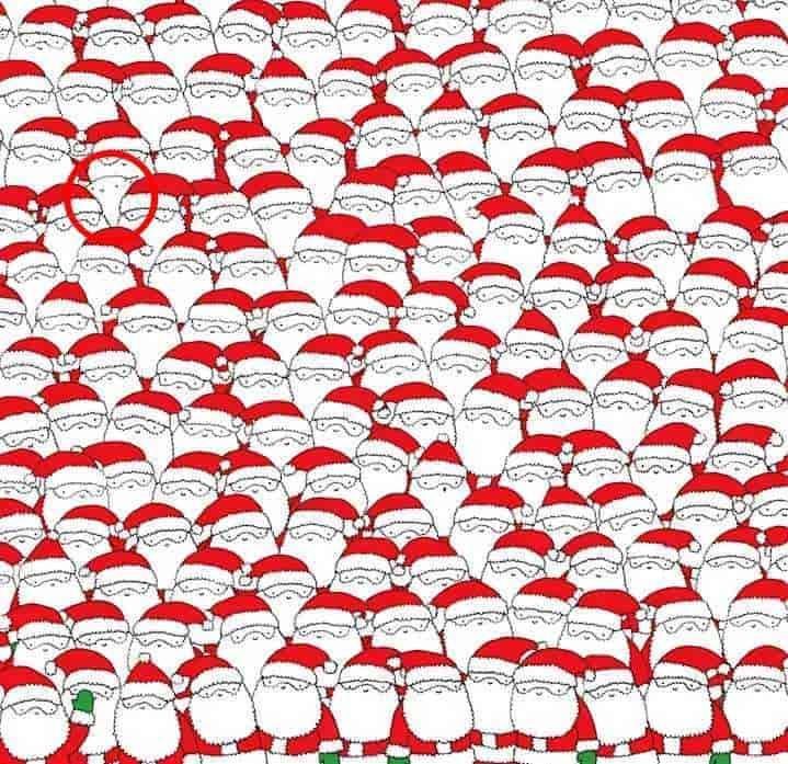 Šioje galvosūkio iliustracijoje tarp daugybės panašių Kalėdų Senelių slypi vienas kitoks elementas – avis. Jūsų užduotis – ją atpažinti per 7 sekundes. Paslaptis slypi tame, kad ieškomas objektas puikiai įsilieja į aplinką, todėl reikia ne tik aštrų regėjimo, bet ir gebėjimo pamatyti tai, kas nesutampa su bendru paternu.