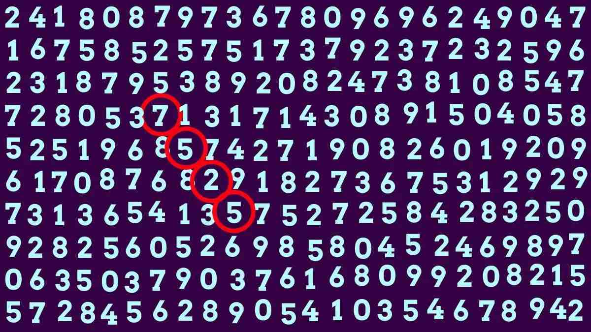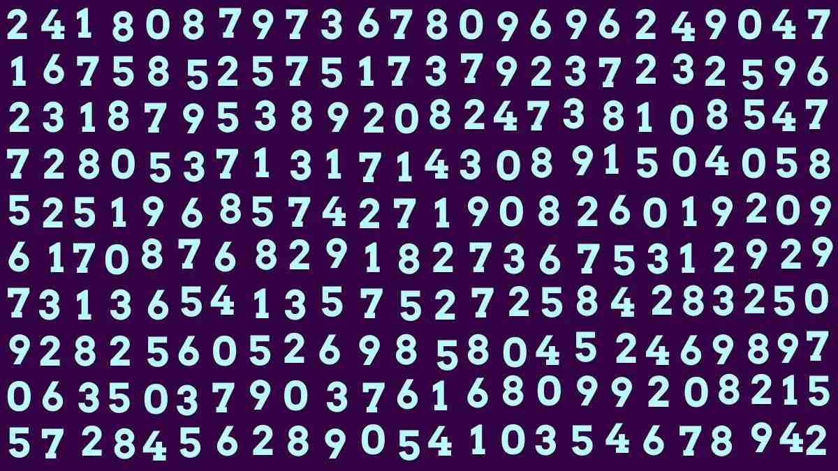 Šioje optinėje mįslėje jūsų dėmesys bus išbandytas iki ribų. Tarp tūkstančių panašių skaitmenų slypi vienas unikalus – 7525. Jūsų tikslas – jį aptikti per 8 sekundes. Paslaptis – nežiūrėti chaotiškai, o sistemingai skenuoti vaizdą.