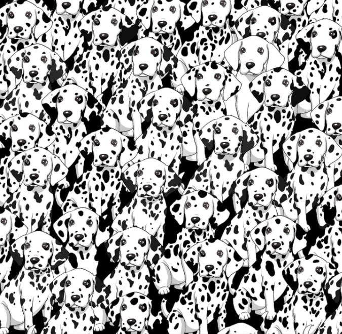 Šiame paveikslėlyje tarp daugybės dėmėtų dalmatinų slepiasi vienas šuo be jokių dėmių. Jūsų užduotis – jį greitai atrasti. Paslaptis slypi tame, kad reikia žiūrėti ne į dėmes, o į bendrą formą ir kontūrus.