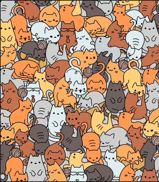 Šioje galvosūkio nuotraukoje slepiasi viena pelė, pasislėpusi tarp daugybės kačių. Jūsų užduotis – ją greitai atrasti, o raktas – žiūrėti ne į akivaizdžius detales, o į mažus, nepanašius į katę kontūrus.