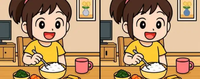 Šiame paveikslėlyje, kuriame mergina sėdi prie stalo, slypi trys subtilūs skirtumai. Jų radimas per 49 sekundes yra puiki smegenų treniruotė, reikalaujanti