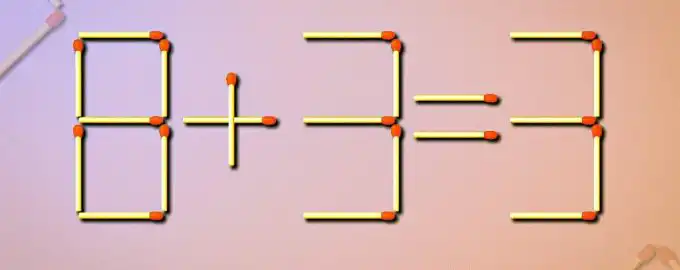 Šioje degtukų galvosūkyje lygtis 8+3=3 yra neteisinga. Jūsų tikslas – perkelti tik vieną degtuką, kad lygybė taptų teisinga. Sprendimas slypi tame, kad